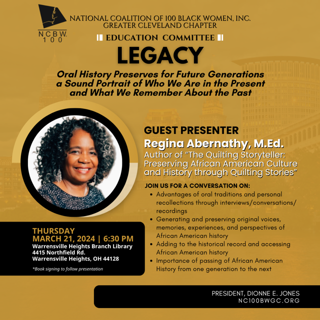 Reviving the Art of Quilt-Making as a Narrative of African American Heritage was hosted by the NC100BW INC. Greater Cleveland Chapter on Thursday, March 21, 2024. Author and presenter Regina Abernathy, M.Ed., led a discussion titled “Legacy: Oral History with The Quilting Storyteller,” focusing on the impact of banning African American books.