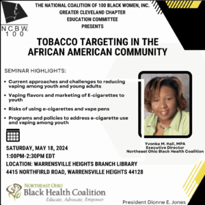 On May 18, 2024, the National Coalition of 100 Black Women, Inc., Greater Cleveland Chapter (NCBW-GCC) hosted an educational program titled “Tobacco Targeting in African American Communities,” led by the organization’s Education Committee. The event aimed to raise awareness about the ongoing impact of targeted tobacco marketing on African American communities, particularly among youth and women.